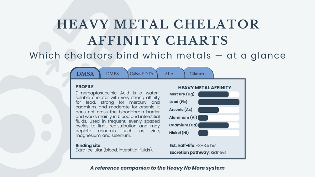 These visual charts map the relative binding strengths of the most commonly used chelators, including DMSA, DMPS, EDTA, ALA, and cilantro, across key heavy metals such as mercury, lead, arsenic, cadmium, aluminum and nickel.